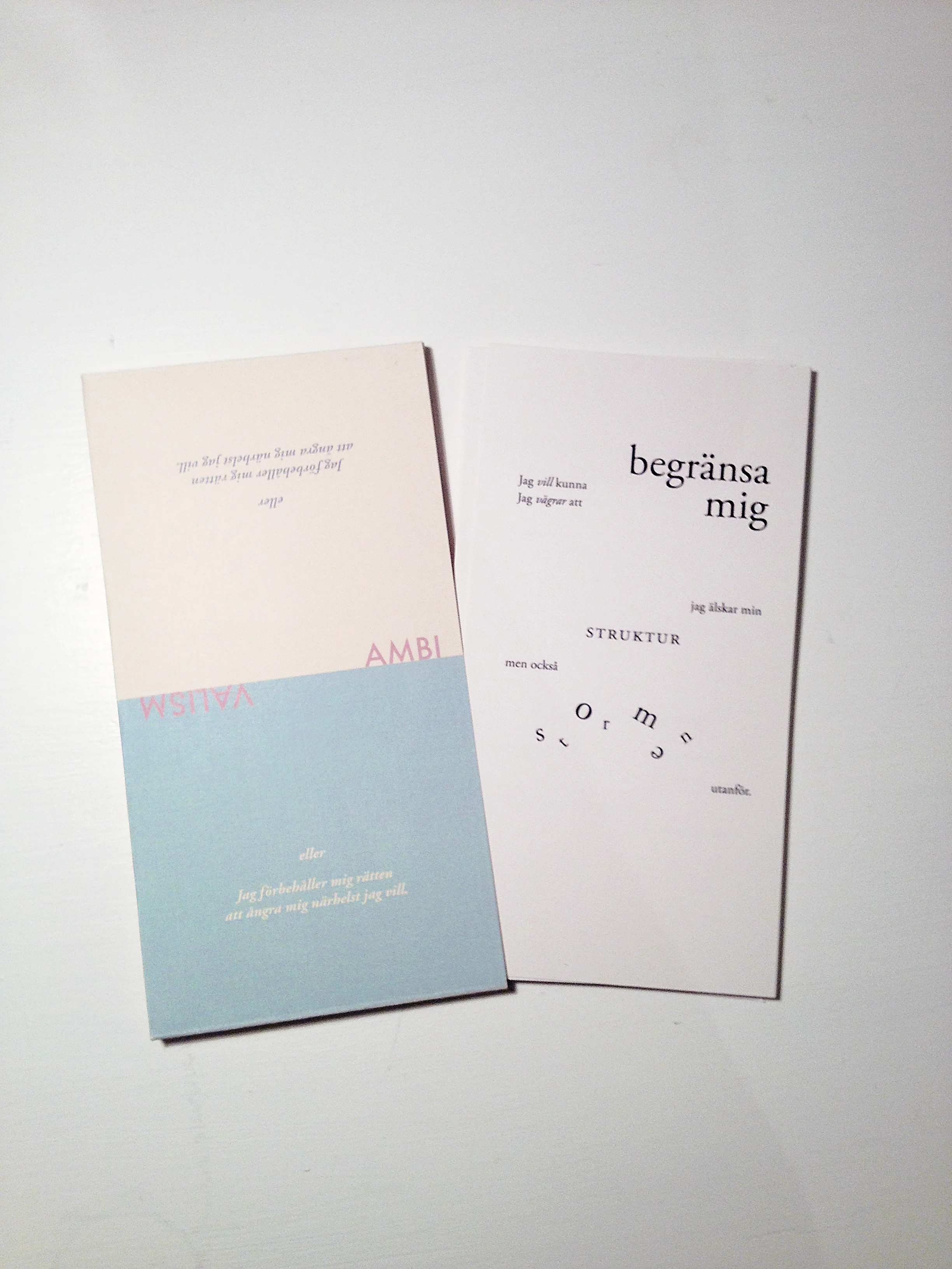 A small book presenting the manifesto of ambivalence. The 16 pages inside the cover are unbound, making it possible to change the order of the text whichever way one might like. The pages are two-sided, with one side set in a very strict and minimal type and the other containing the same text but with expressive typography.